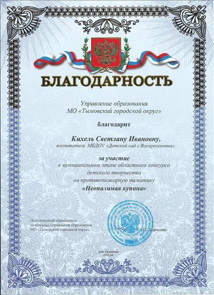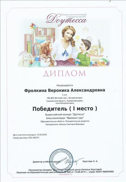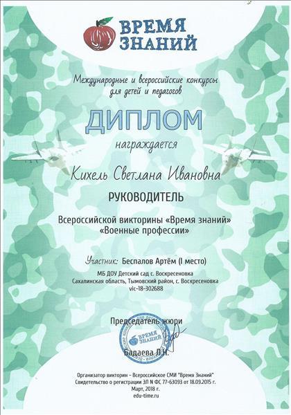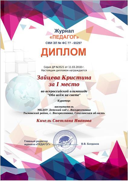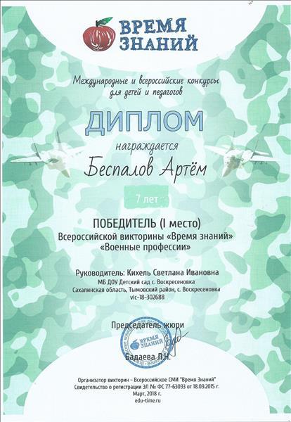 Диплом воспитанника I место во всероссийской олимпиаде "Обо всём на свете"